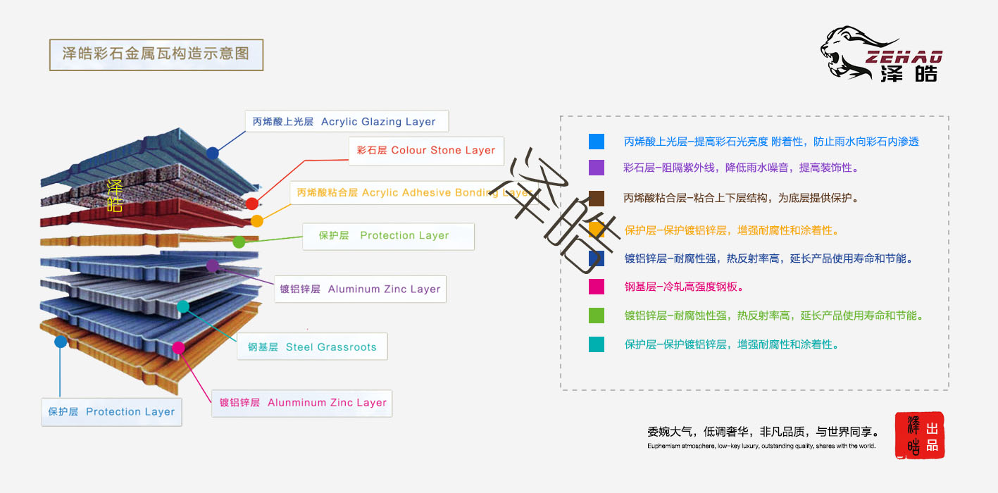 泽皓彩石金属瓦采用高新技术生产的,以防腐性能优异的镀铝锌钢板为基板,以耐候性极强的丙烯酸树脂为黏合剂,以彩色天然沙砾为面层经特殊工艺加工制成的新一代金属屋面材料,是创新型、复合型、环保型高科技产品的新型高级屋面材料。因其美观、轻巧、耐用、环保,彩石金属瓦具有传统陶土瓦的自然、浑厚的优异装饰性能,又具有现代金属瓦轻巧、坚固、耐久的优良使用性能,是目前国际上的主流高级屋面材料。近年来已经成为国际屋面材料的主流产品,国内的一些高档建筑也已开始使用。