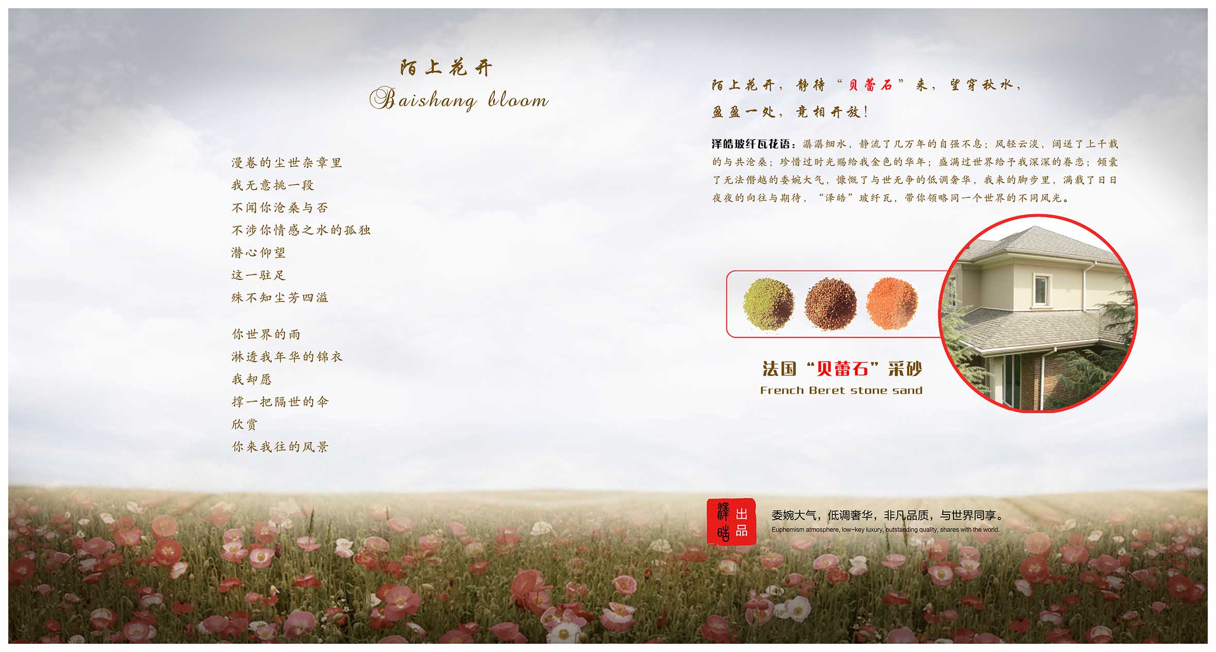 泽皓玻纤瓦花语:潺潺细水,静流了几万年的自强不息;风轻云淡,阔送了上千载的与共沧桑;珍惜过时光赐给我金色的华年;盛满过世界给予我深深的眷恋;倾囊了无法僭越的委婉大气,慷慨了与世无争的低调奢华,我来的脚步里,满载了日日夜夜的向往与期待,“泽皓”玻纤瓦,带你领略同一个世界的不同风光。