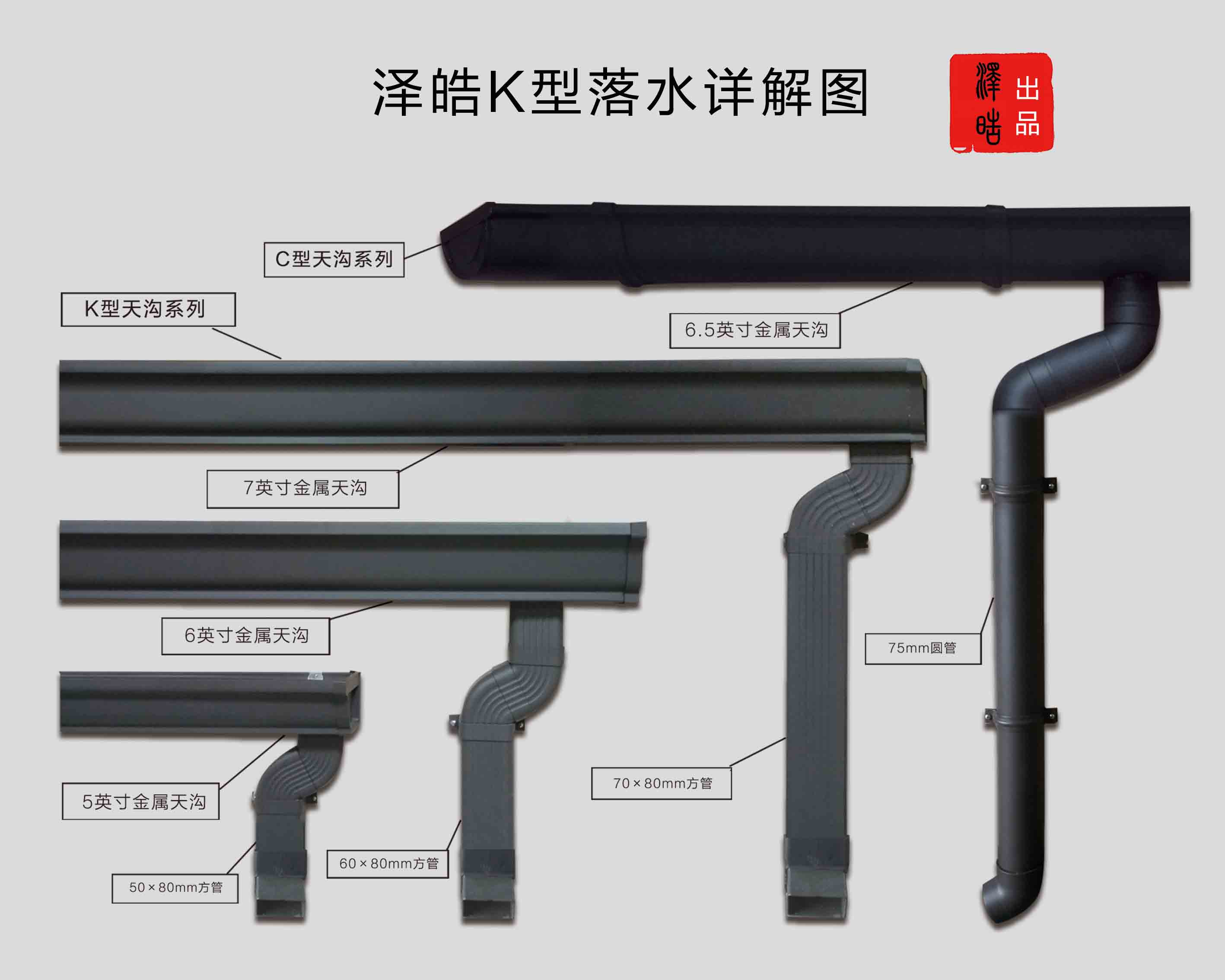 1、5.5英寸K型彩铝雨落水系统产品是指檐沟上开口尺寸为5.5英寸(140mm)的K型双曲线外观的檐沟,搭配2x3英寸的波纹矩形管或3英寸圆形的雨落水管的屋面雨落水系统。