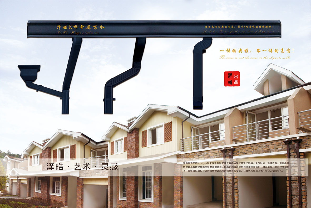 2、彩铝落水系统涵盖多种材质,多样化风格,规格齐全,充分满足开发商特殊的建筑需求;产品造型满足不同建筑风格:双曲线造形的K-style型天沟搭配波纹矩形雨落水管,风格现代、简约、时尚、典雅。同时金属的质感给您的建筑立面带来朴实视觉感受。