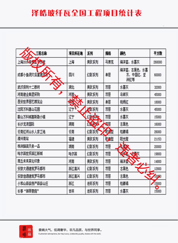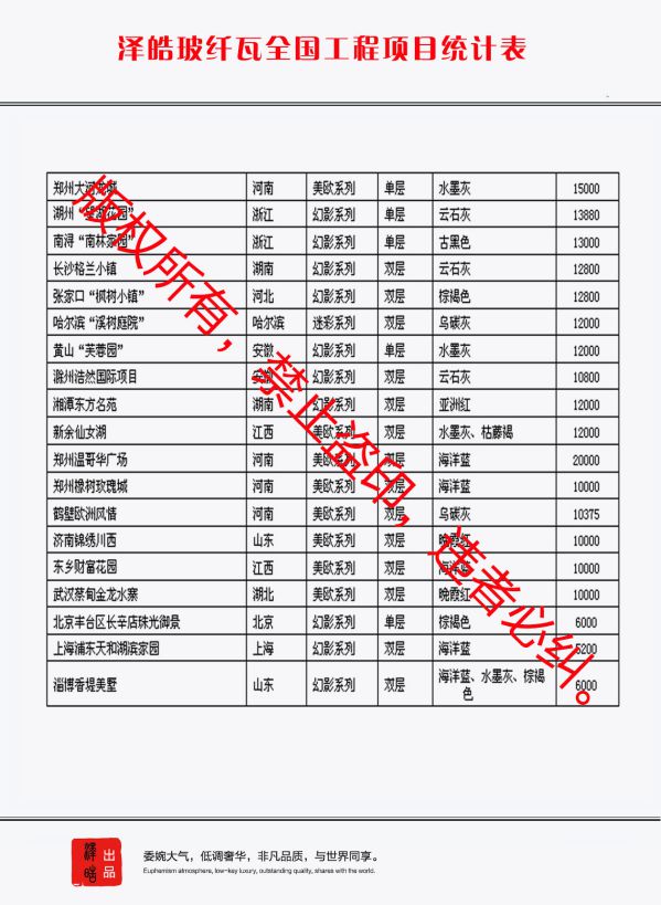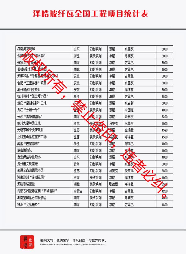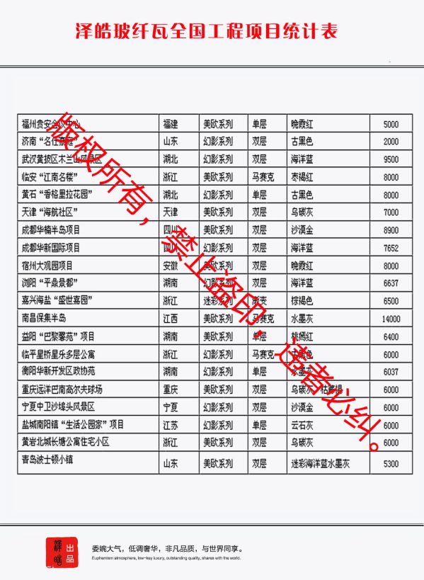 泽皓全国玻纤瓦项目分布全国各地各省市,经过八年的奋斗,项目逐步整理出全国详细工程案例的名单和工程案例图片,以供大家参考。