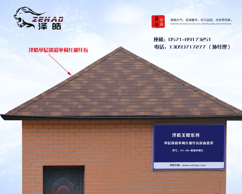 泽皓玻纤瓦产品分为五大类型:单层标准型,双层标准型,马赛克型,歌德型以及鱼鳞型。五大类型能满足整个屋面系统的基本需求,无论南北方,每个产品的特点都能完美胜任,产品系统的开发主要跟对国内建筑风格而做得定位。单层标准型虽然少了屋面的层次感,但是它平整有序,装饰缝整齐划一,平整有序给人的感觉并不是单调乏味,超薄的纤体使得平整更加的引人注目,正是这种过于平整的屋面材料,使得屋面干净整洁,远远望去,像是没有盖什么东西,似有似无。近距离看才能清晰的看到瓦片的身影,很难想想这样一种超薄的瓦片对屋面会起到什么保护作用?材料的本身就是多层防水,又有很强的耐候性,再加上时尚赋予瓦片的“薄”,更让玻纤瓦在时代的潮流中屹立不倒,追捧抢手。横刻在屋面上的装饰缝似乎是天然刻在屋面上一样,精致美观,装饰缝的作用不仅是为了整体看起来更有线条感,还有就是能够顺水的作用,雨水顺着装饰缝能够迅速、顺畅的留到檐沟,保证了屋面的排水性能。