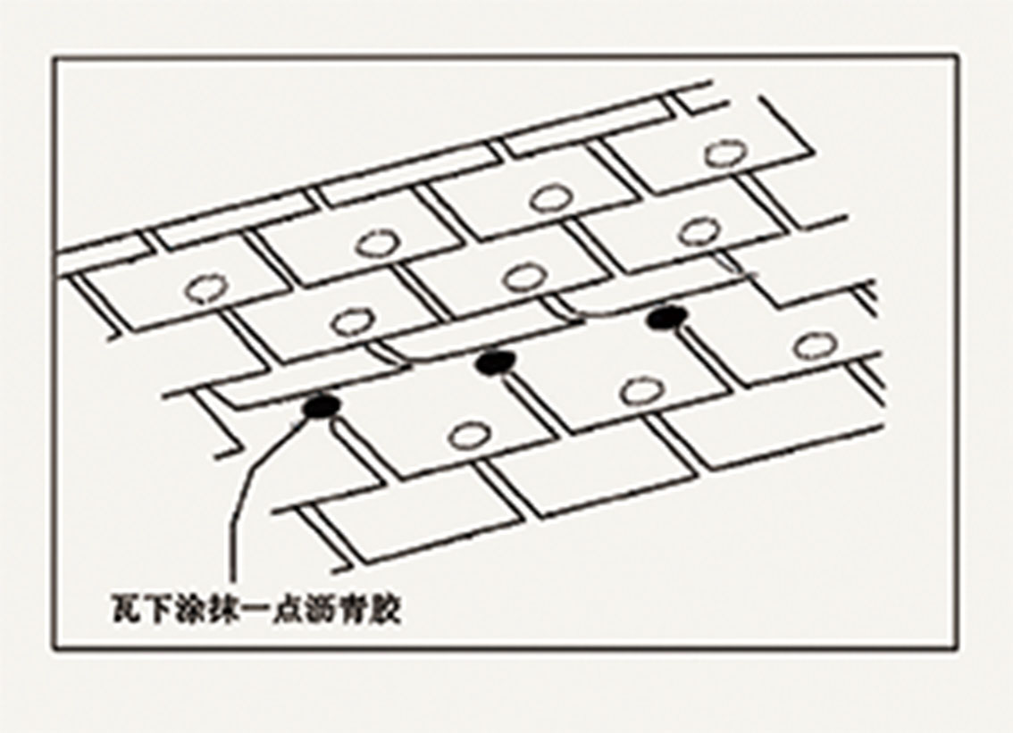 泽皓玻纤瓦自粘胶在太阳光下能被激活,使瓦片之间产生粘结。但是在温度较低时,粘结时间比温暖的季节更长一些。粘结时间也取决于地理位置,屋面坡度,房屋的朝向和施工季节。对于木质结构,在春秋冬季,使用泽皓玻纤瓦非全背胶产品时,建议采用点胶方式安装。对于钢筋水泥屋面,无论季节如何,建议在使用泽皓全背胶产品时,采取点胶的方式安装玻纤瓦,目的是加强瓦片的粘结性。点胶位置:距离瓦片25mm到50mm处,不能靠近瓦片的左右两侧和底边,防止挤压瓦片时,沥青胶被挤压在瓦片外。