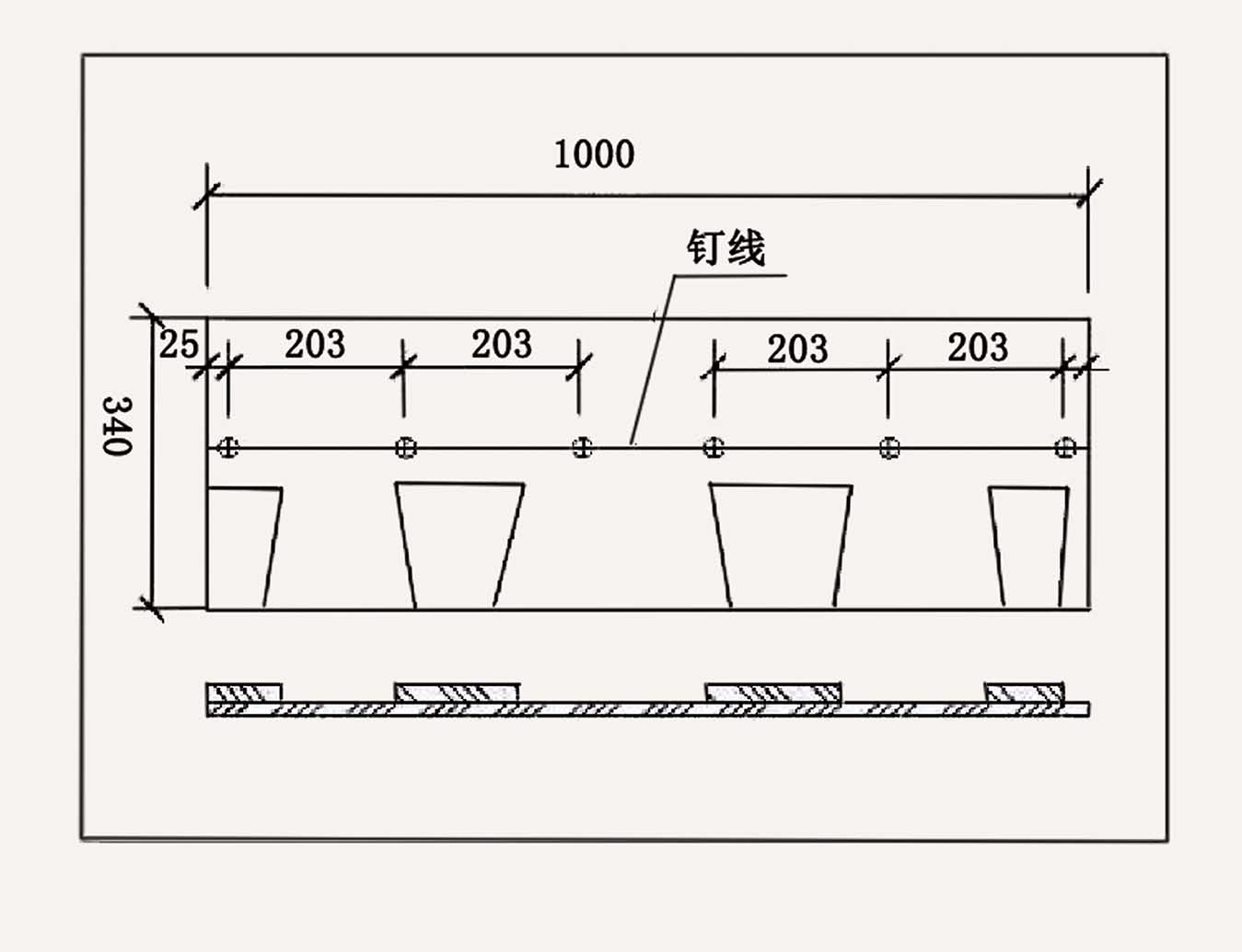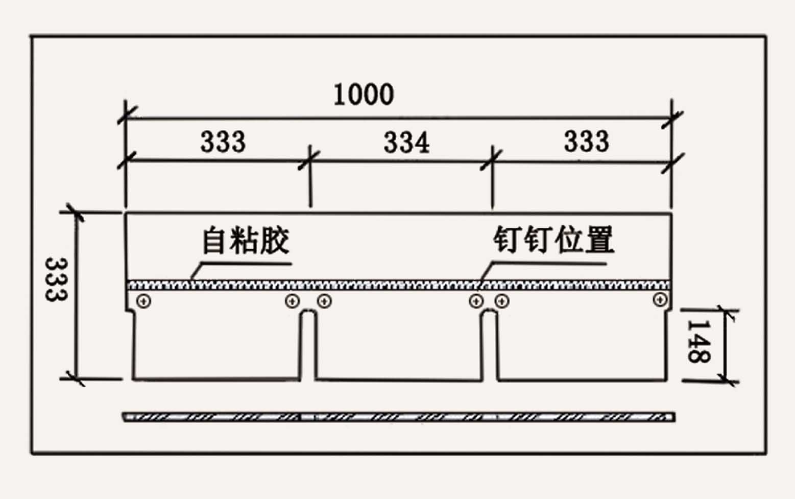 (1):在单层瓦上固定钉子每张瓦要钉6个钉子,初始层要钉4个钉子。钉子的位置位于装饰缝上方16mm处,距离两边端25mm处,且距每个装饰缝中心左右各25mm处。