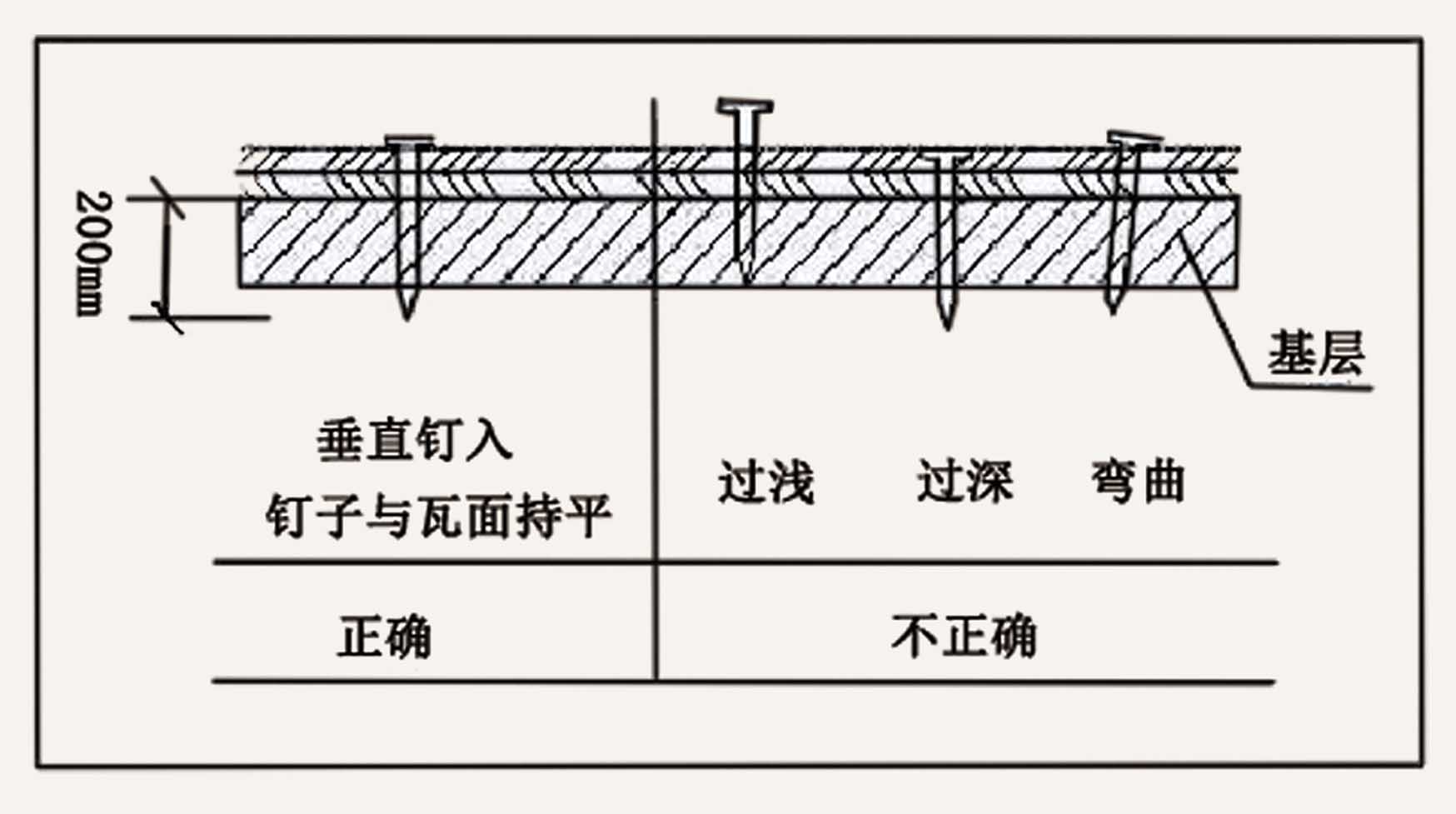 (6):钉子钉入方向应与屋面垂直,且钉帽与瓦齐平。