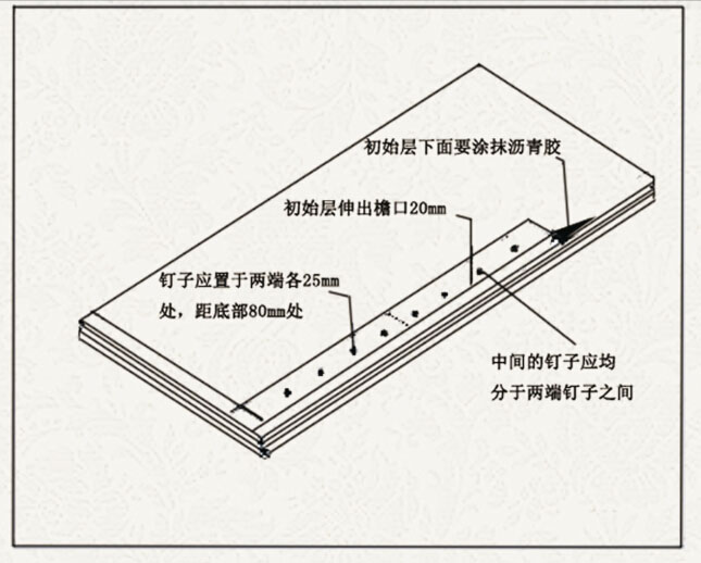 层两边端部分距底边80mm和距侧边25mm的地方分别用一个钉子固定,然后再这