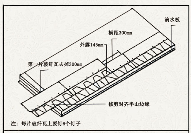 如图所示,用整张玻纤瓦开始并按顺序依次铺设瓦,沿着山墙边缘和檐口要确保
