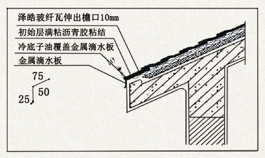 3:在安装玻纤瓦前,先将金属滴水板按图所示固定在檐口(如图5.2.1)
