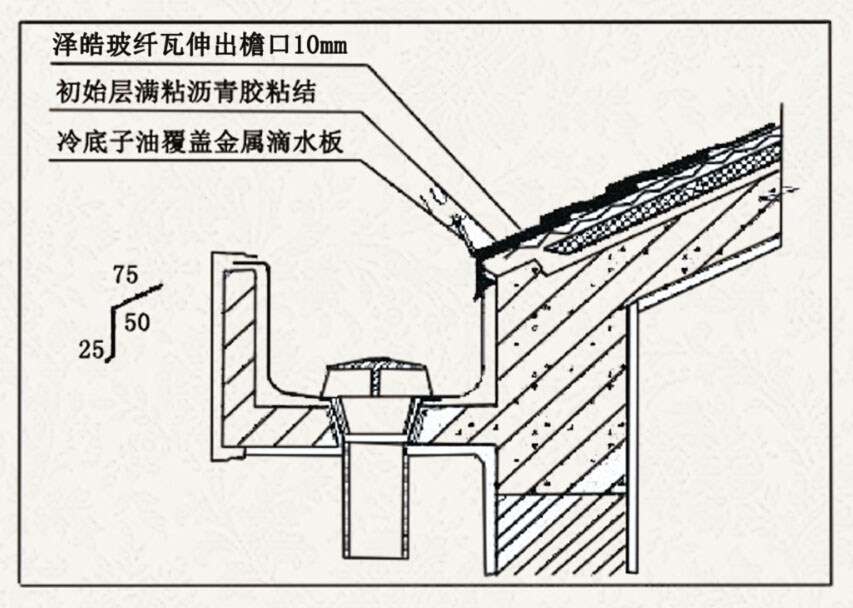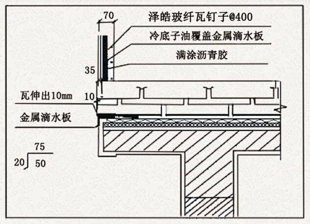 2:滴水板由屋面边缘向内伸进75mm,向下弯曲盖住檐口。