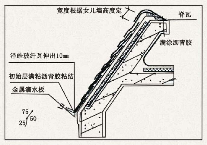 1:至女儿墙压顶处的最后一层瓦片必须覆盖在压顶上,覆盖在压顶部分的瓦片底满涂沥青胶,同时每片瓦固定4个钉子。
