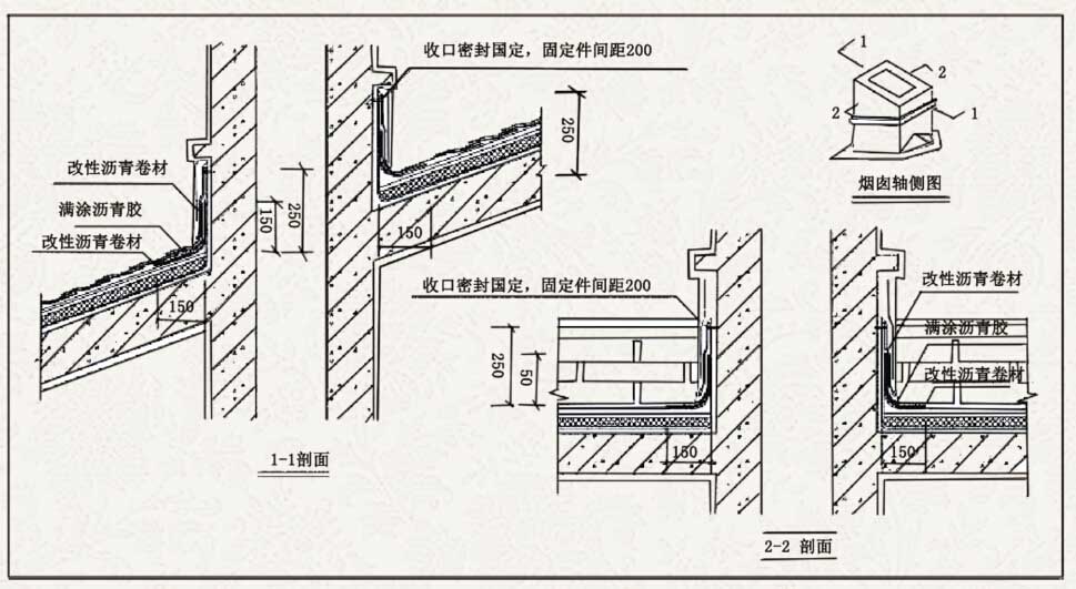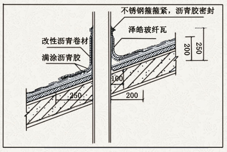 100mm,顶端收于装饰腰线下,收口处使用钢钉进行固定,沥青胶密封,钢钉间距200mm.
