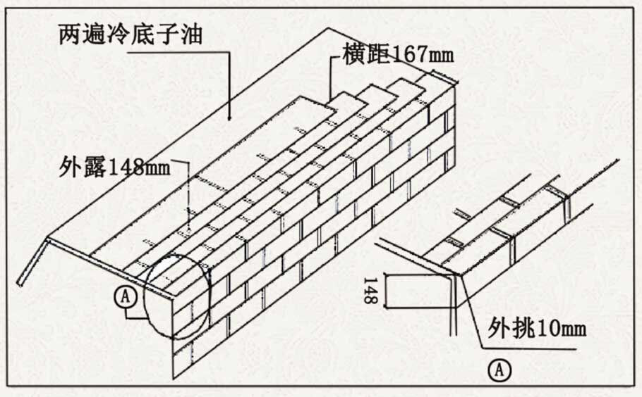 至里面150mm高度,在平面150mm和立面上,瓦片使用沥青胶满粘在基层上,即瓦片铺设时,在