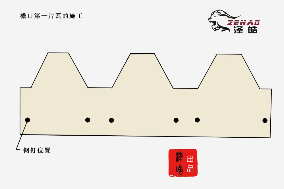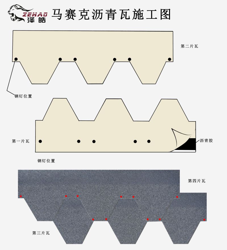 第一层瓦的铺装菱形茬口要倒过来和起始层对齐,钉子固定的位置和起始层差不多,到第二层的的时候,钉子固定的位置出现了明显的变化,不是钉在原来被覆盖住位置的中心了,而是钉在了玻纤瓦几个装饰顶上方,这里强调泽皓马赛克玻纤瓦是全背胶的,如果屋面的坡度非常陡峭的情况下,必须采取六颗钉子来固定,六颗钉子的位置为两侧装饰缝上面各一个,中间两个装饰缝各两个,这样才能保证瓦片不被吹掉的可能。如果屋面坡度比较浅,在30-45度之间,可以采取四颗钉子固定,四颗钉子的位置,在两侧各一个,在中间装饰缝顶上面的由原来每一个装饰缝两颗钉子变成一颗即可,在带上全背胶的支撑,可以保证瓦片的固定能力,六颗更为保险点而已。
