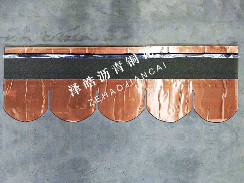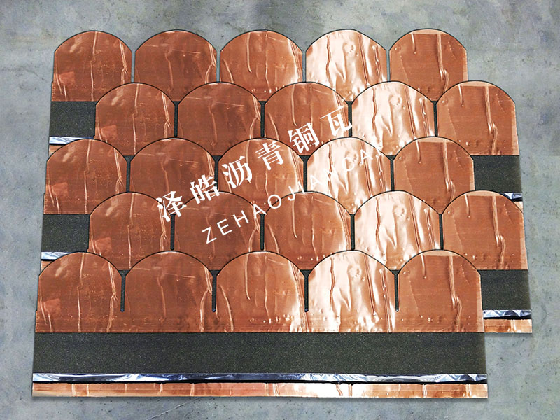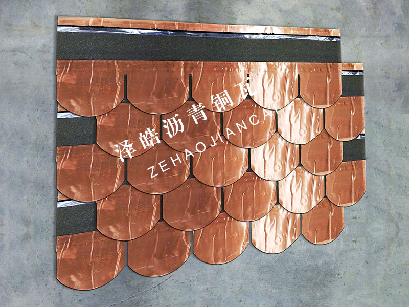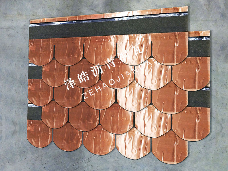 PRODUCTS CENTER| 产品名称:鱼鳞型沥青铜瓦 | 产品规格:1000mm*333mm*2.6mm | 产品颜色:铜色 |